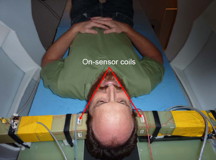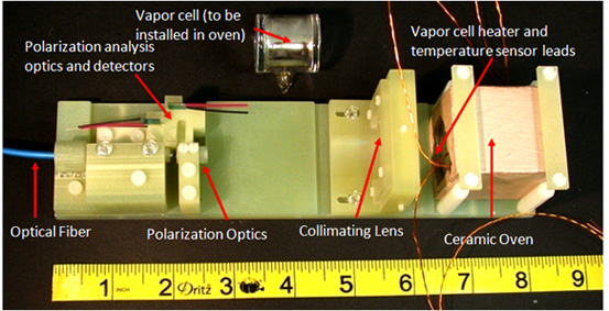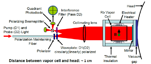 The Atomic Magnetometer MEG system uses a novel sensor design that allows it to be compact, highly sensitive, and versatile enough to be readily arrayed around the human skull. In the system, the pump and probe laser light are delivered via a single polarization-maintaining optical fiber, leaving the magnetometer with a single optical axis. The use of an optical fiber instead of beams propagating through free space allows the device to be oriented at any angle necessary for arraying the sensors properly around the head. The single optical axis allows the sensor to be long in one dimension but short in the other two dimensions so that the sensor has only a 4 cm by 4 cm footprint on the subject’s head. The device has four spatially separated magnetometer channels to measure the magnetic field gradients.