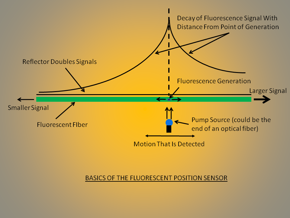As show in the figure, a small excitation source, such as a laser or LED, excites a localized area of fluorescence at an unknown position along the fluorescent fiber.As the fluorescent light travels down the fiber, the intensity of the fluorescent light decreases due to absorption.The ratio of the two signals from each end determines the position of the object along the fiber. Appropriate modulation of the excitation source causes ambient light to be of no consequence and allows one to measure the position of several objects simultaneously with a single fluorescent fiber and a single set of photodectectors.The flexibility of the fluorescent fiber allows for the determination of positional changes that do not occur along a straight line.The use of an array of such fibers allows for the detection of two-dimensional changes in position.
