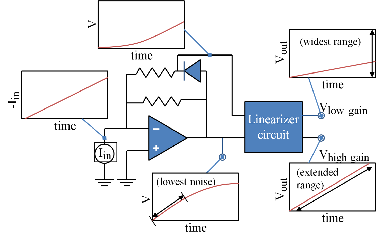 Many applications require detection of both very small and very large signals. High gain detector amplifiers provide low noise but are easily swamped by large signals. Logarithmic amplifiers provide a wide range but contributing to distortion. Auto-ranging circuits lose data when switching between low and high gain. Detecting over a wide range is especially challenging for modern low supply voltage integrated circuits.
