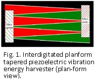 In our primary vibration energy harvester configuration, a planform tapered piezoelectric bimorph serves as a spring support for a sense mass as well as the transduction mechanism for converting mechanical to electrical energy. In this case, there are two sets of interdigitated beams (red and green in fig. 1) with each segment tied together mechanically through a common sense mass. The planform taper of each beam allows for maximum transduction efficiency, due to stress equalization along the beam’s length, during vibration-induced motion of the sense mass (in/out of the page). Interdigitation of the tapered beams allows the maximum volumetric efficiency, thus the highest power density possible. Modeling shows that the planform-tapered interdigitated configuration has a two-fold power advantage over non-tapered configurations.