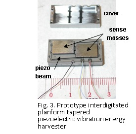 A schematic of a prototype piezoelectric transduction element (fig. 2), shows two sets of interdigitated beams with each consisting of two tapered beams. The fabrication is straightforward where a three-layer material stack up (piezo, shim, piezo) forms a plate in which a single zigzag through cut is made to define the interdigitated tapered beams. In this case, nickel electroding forms a parallel electrical connection between the two tapered beams of each beam set. An optimal resonance frequency, configuration and size can be designed for any vibration environment and application. As an example, a prototype device (fig. 3), has a packaged volume of 3.5 cc and employs two sets of interdigitated beams with a tungsten sense mass per beam set. This harvester has a resonance response at 70 Hz and generates 0.6 mW of alternating-current power at over 6 volts in response to a 0.4-g harmonic vibration source. For a random vibration environment with a power spectral density of 2×10-3 g2/Hz near 70 Hz, this device outputs 0.24-mW of alternating current average power into a 70kW load. For additional details of the vibration energy harvester utilizing planform-tapered interdigitated beams see Patent # US 7,948,153.