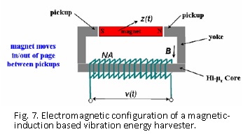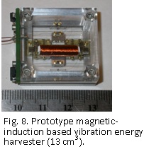 This technology incorporates a magnet that is movable through a gap in a ferromagnetic circuit, where a coil wound around a portion of the yoke forms an electromagnetic circuit for energy transduction (fig. 7). A flexible coupling is used to attach the magnet to a frame for providing alignment of the magnet as it moves or oscillates through the gap in the ferromagnetic circuit. The motion of the magnet can be constrained to occur within a substantially-linear range of the magnetostatic force developed by the magnet-pickup interaction to create a spring return force. In turn, the spring force and mass of the moving magnet combine to dictate the operational resonance frequency. As for the piezoelectric devices, velocity damped resonant principles provide a basis for modeling and performance prediction. A millimeter-scale magnetic induction based prototype (fig. 8) was fabricated using lithography-based molding and electroplated Permalloy to form the spring and magnetic components. Matching of the coefficient of thermal expansion of material forming the support frame and the magnet suspension was key to the structural stability for changing temperature conditions. For additional details of this vibration energy harvester utilizing magnetic induction for a range of temperature environments see Patent # US 7,498,681.